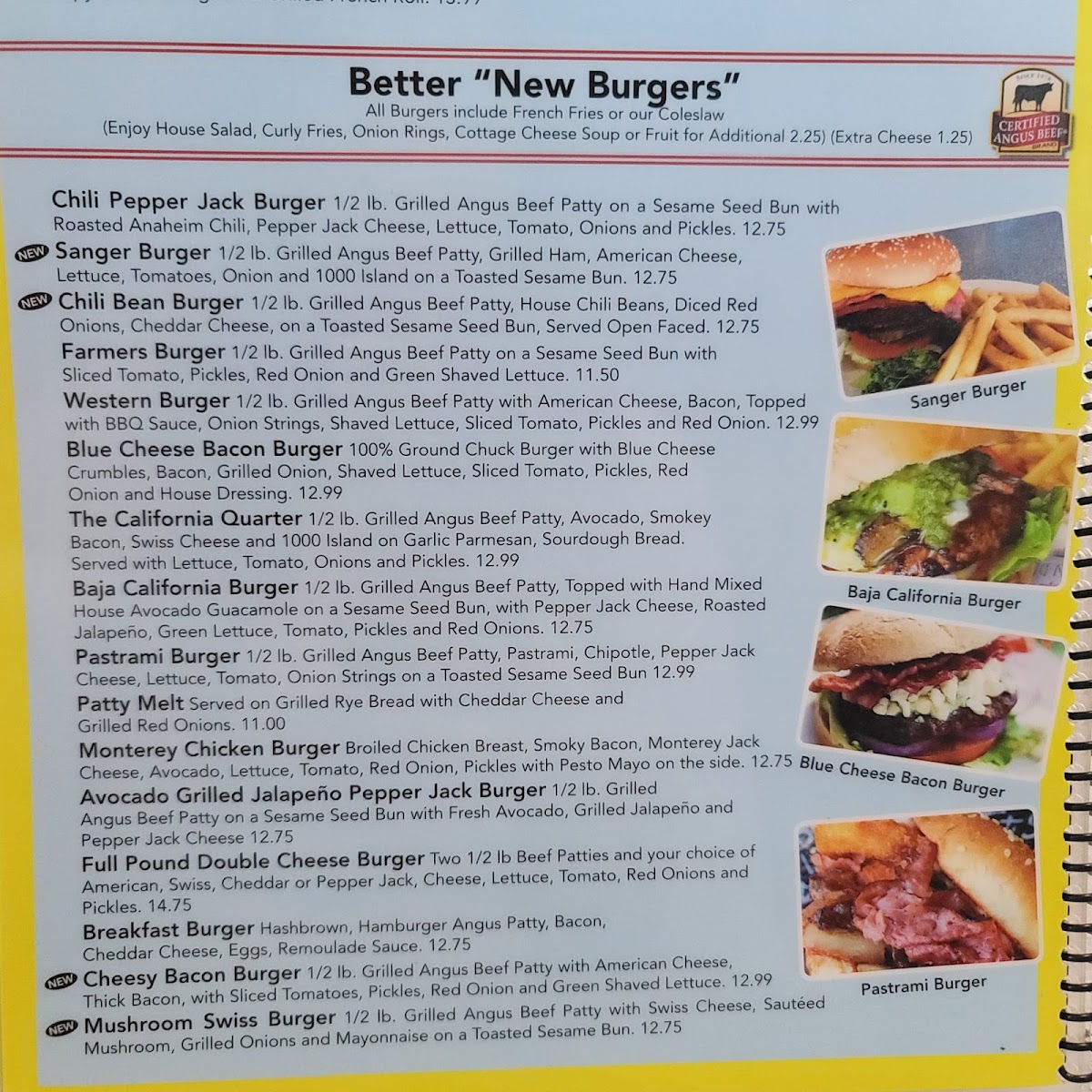 Additional menu highlights include breakfast staples such as chicken fried steak with hashbrowns and eggs cooked over medium, breakfast burritos, omelets with various fillings, and French toast options. The menu also includes a selection of sandwiches and burgers, with options like the Western Burger and Blue Cheese Bacon Burger served with fries.