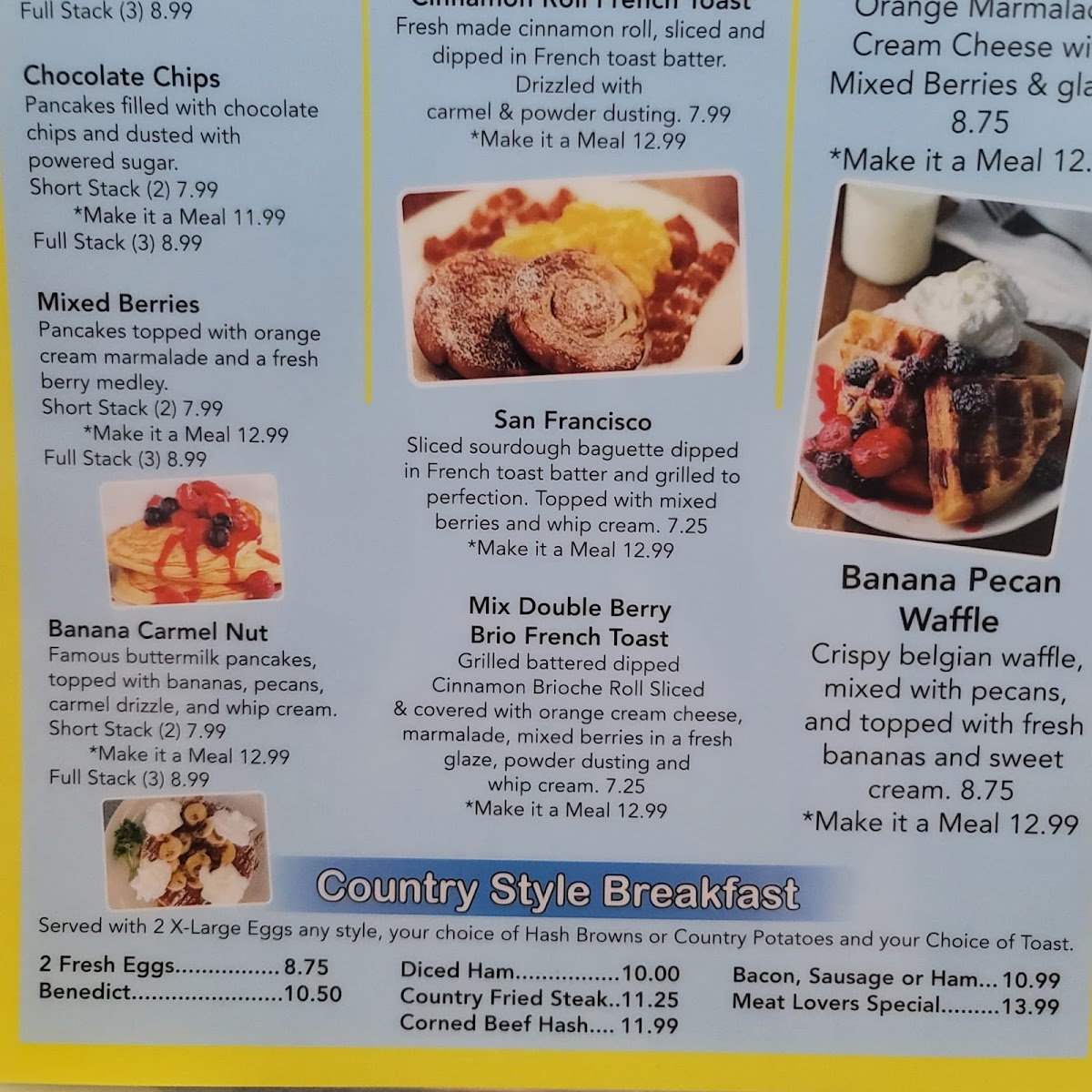 This menu is suitable for those seeking breakfast, brunch, or casual American and Italian-style meals with an emphasis on traditional and regional flavors. Orders are typically placed for dine-in service, offering a range of options for both quick and relaxed meals throughout the day.